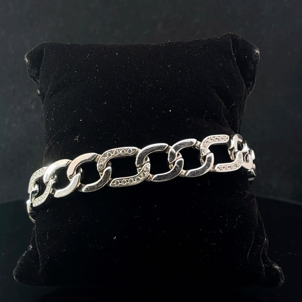 Designed for those who appreciate both substance and style, this bracelet offers substantial presence (XX grams) without sacrificing comfort. The square Cuban construction provides a modern twist on the classic chain design, while the strategic stone placement creates a tasteful balance between boldness and refinement. A heavy-duty locking clasp keeps the bracelet securely fastened while maintaining its seamless aesthetic flow. The rhodium-plated sterling silver resists tarnishing, ensuring the piece maintains its luminous shine through daily wear.